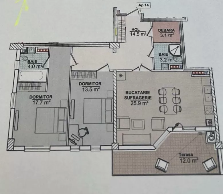 Compartimentare : antreu, bucatarie comasată cu living, 2 dormitoare, 2 grupuri sanitare, garderobă, terasă.